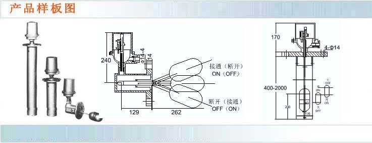 该控制器有浮球,连杆、铁芯部分和磁性开关发信转换机构组成,随着容器内液位的变化,浮球产生相应的位移。从而带动连杆、铁芯上下移动,使铁芯与磁钢的相对位置发生变化,通过铁芯与磁钢相互磁引的作用,磁钢-微动开关转换机构翻转,微动开关动作,实现对液位的报价和控制,控制器合理地选用了密封引磁隔离离开关发信转换机构,使永磁元件不能直接接触介质,避免了因介质内部的混蚀杂质而引起轧煞和卡死现象。